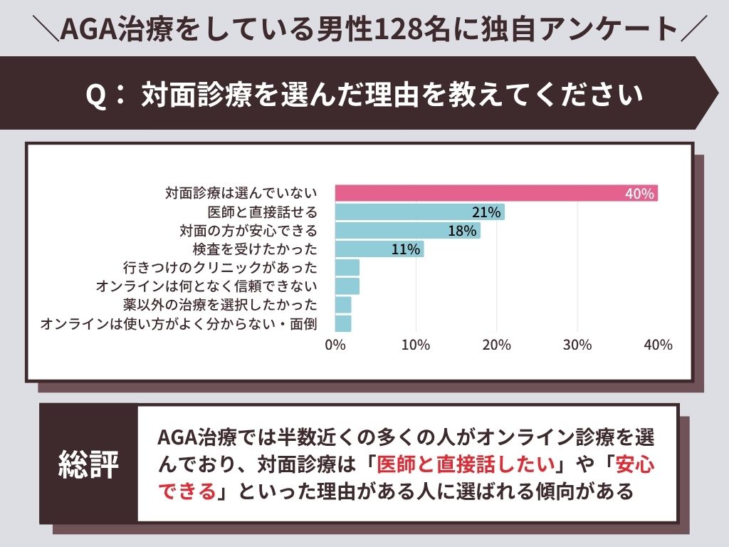 そして、対面診療ではなくオンライン診療を選んでいる方が回答者全体の40%を占めていることもわかりました。
