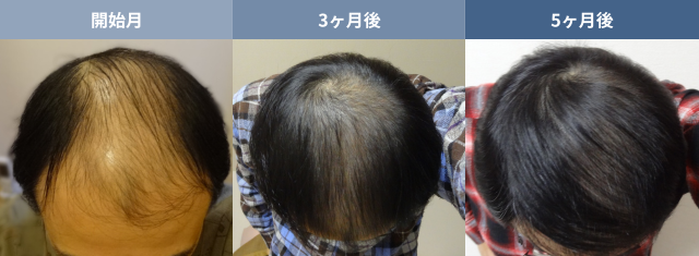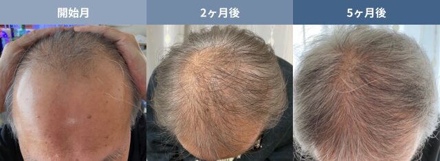 6ヶ月近く予防と発毛の内服薬で治療した方は、2~3ヶ月目頃から全体的な頭皮の透けが目立ちにくくなり、5ヶ月経過した頃には地肌はほぼ見えず、新しく生えた毛髪もしっかりと長さが伸びていることが分かります。