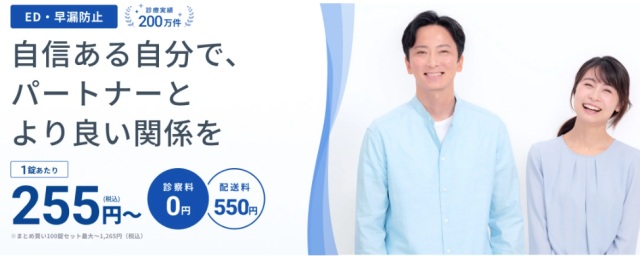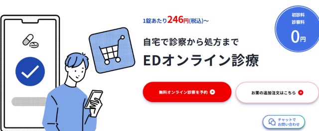 | 特徴 | ・業界大手で安心 ・ED薬取扱種類が充実 ・24時間最短15分後の診療※1 | ・料金が安い ・初診料・診察料が0円 ・選べる錠数が多い | ・バレない配送を徹底 ・200錠の大容量がお得 ・LINE相談できる |